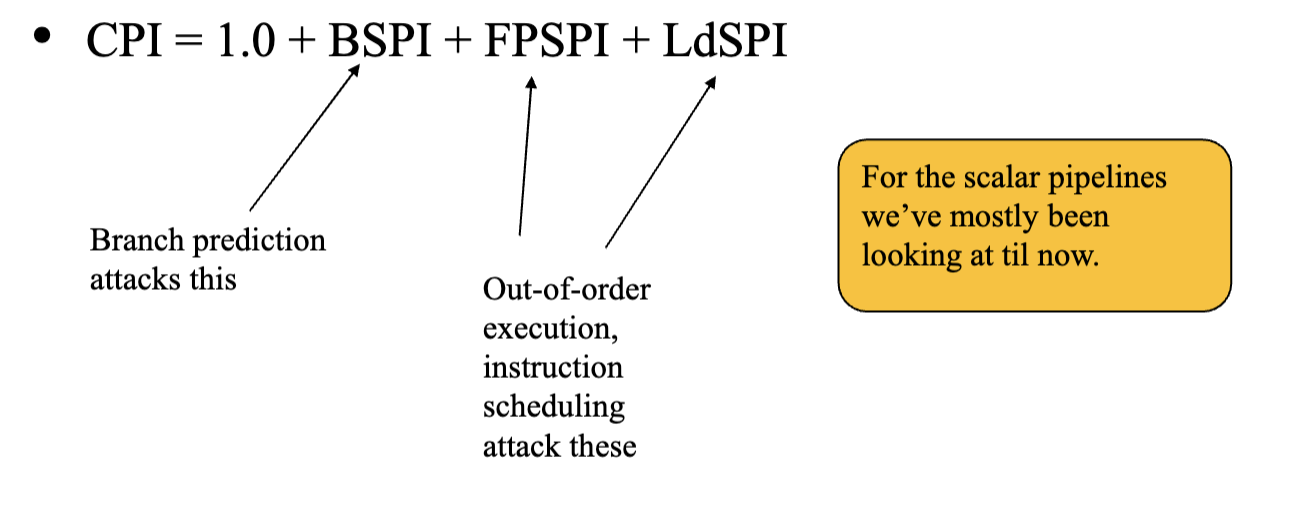 - LdSPI - load stalls per instruction When BSPI, FPSPI, LdSPI approach 0, we’re bounded by the base CPI 1 for scalar