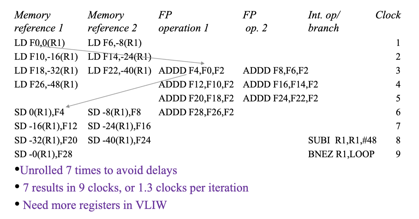 - Try to fill 5 instruction format, lots of nops as a result, but requires compiler techniques to fill, like loop unrolling