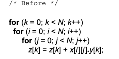 - Multi loop code that accessing a matrix in strides of row in the inner loop. Better locality can be achieved by row column order, by sequential access through columns in inner loop or sequential access in memory.