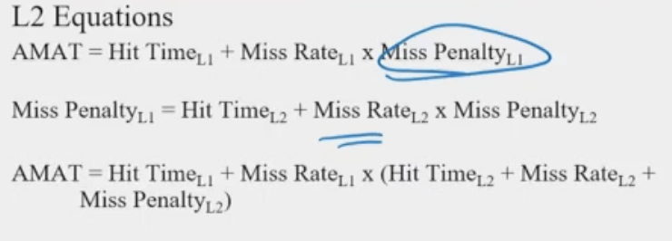 - Global miss rate - misses in this cache / total number of memory accesses generated by CPU ()