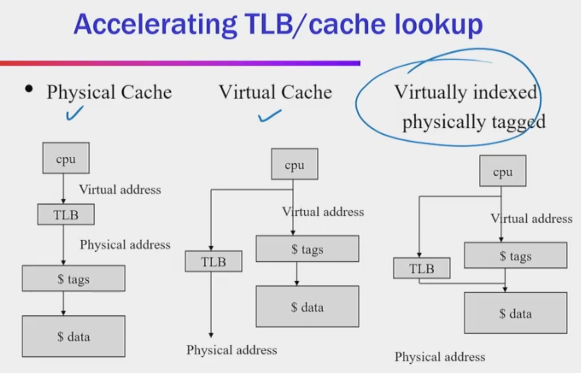 Note: If index and block are within page offset, TLB translation can be done in parallel because it only affects the high bits of virtual page number. Cache can still check for set hit or miss. Although still need to wait for TLB for tag hit or miss