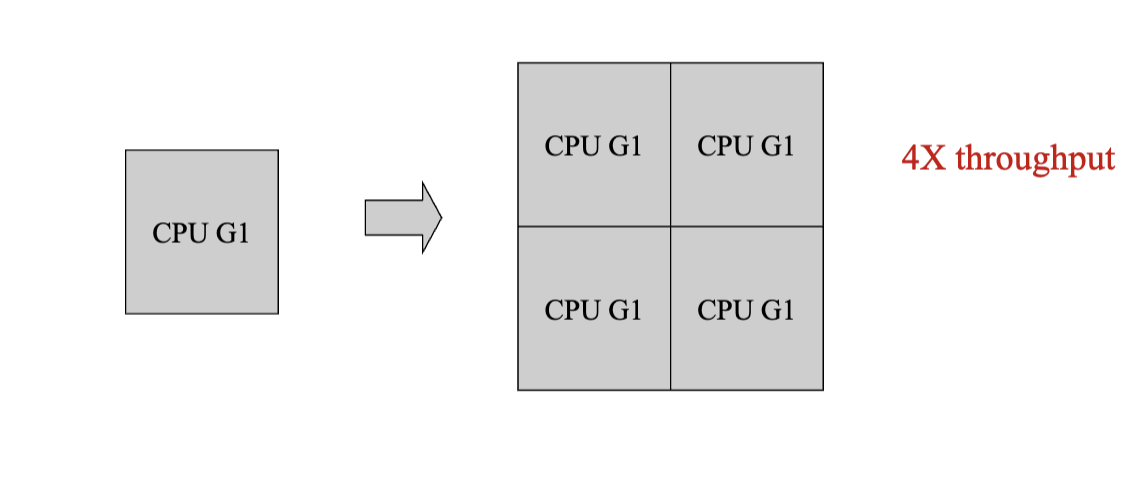 - Tradeoff: smaller 4x smaller CPUs rather than 1 super big CPU