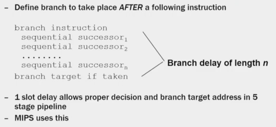 - One instruction after the branch is always executed - delay branch for 1 instruction