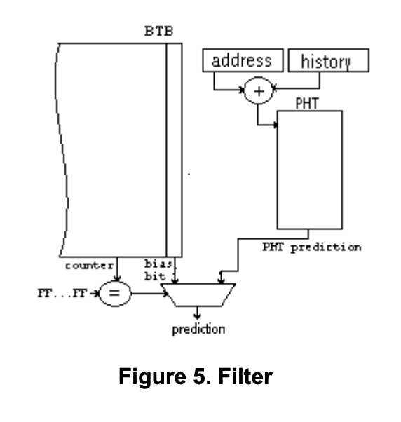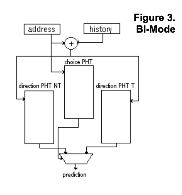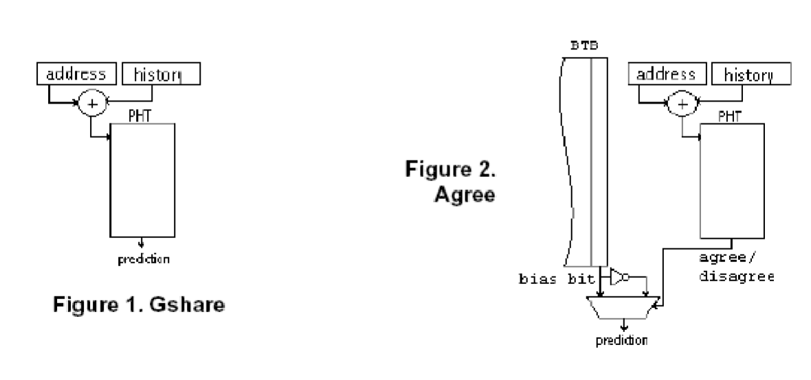- assigns a biasing bit to each branch in Branch Target Buffer (BTB). PHT info is changed to “agree” or “disagree” with prediction of the biasing bit. Both need to be in the agree state to take. or both in disagree to not take