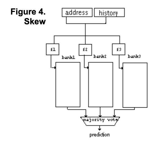 - Gshare is bad for aliasing. When addr XOR history for key, completely random → values become noisy