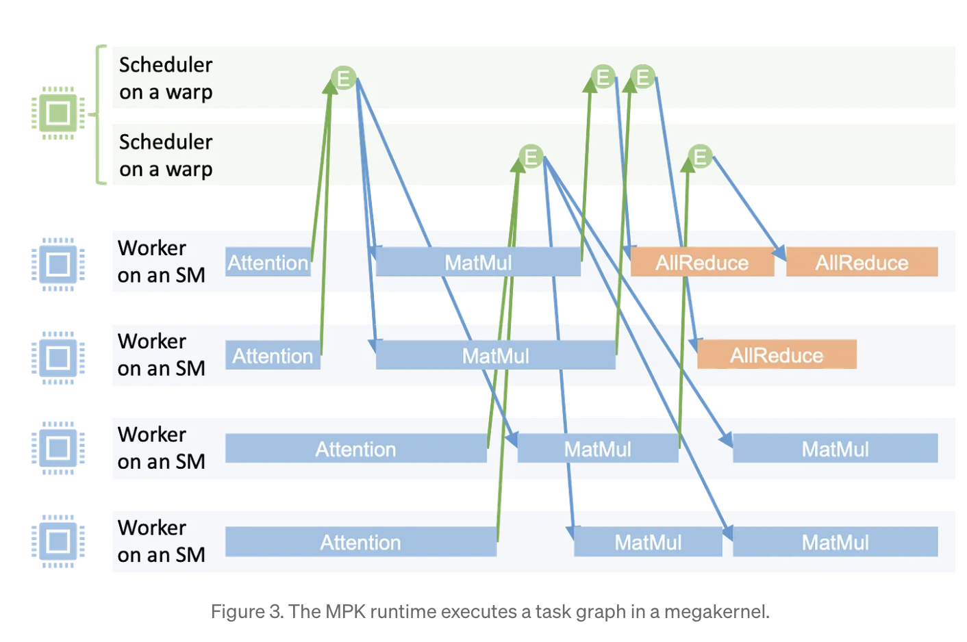 Schedulers Scheduling decisions are handled by MPK’s distributed schedulers, each of which runs on a single warp (execution unit on a NVIDIA GPU) It continously: