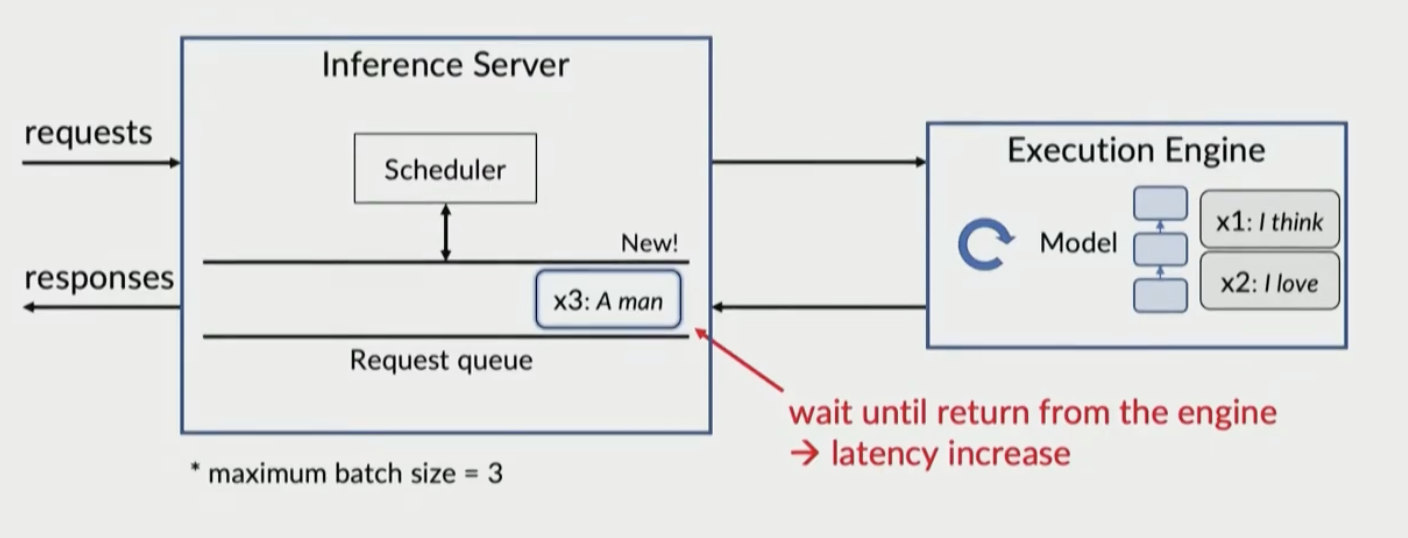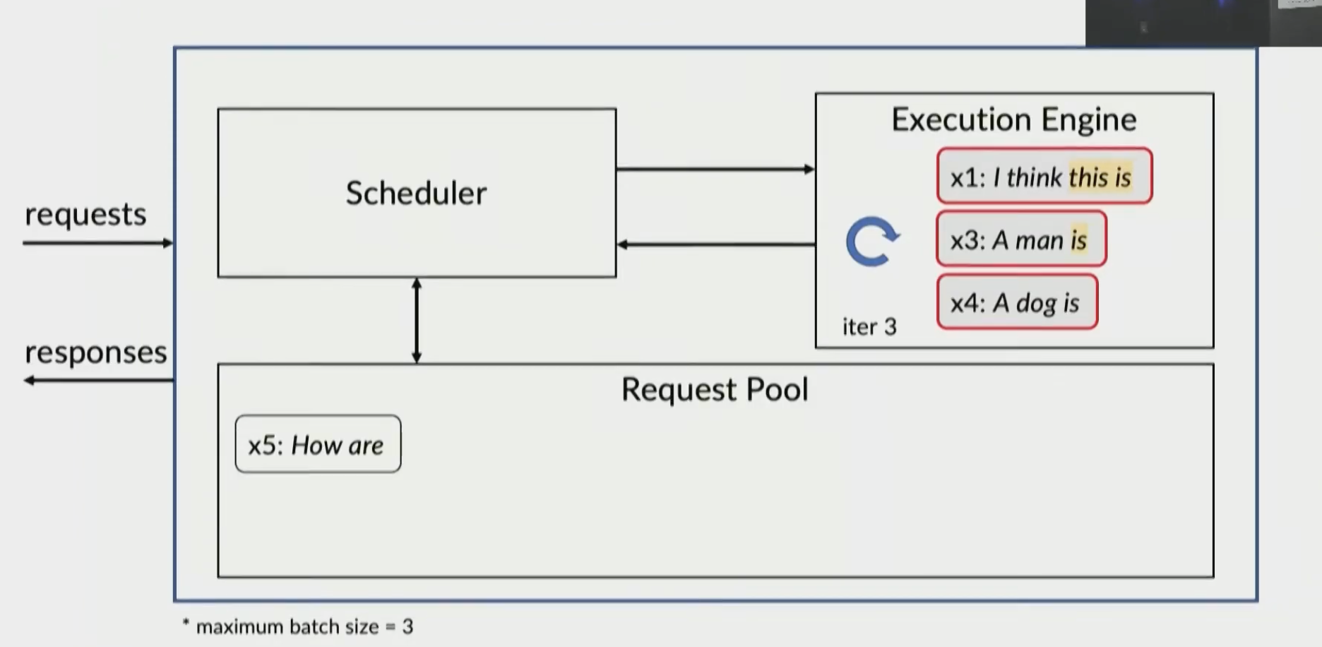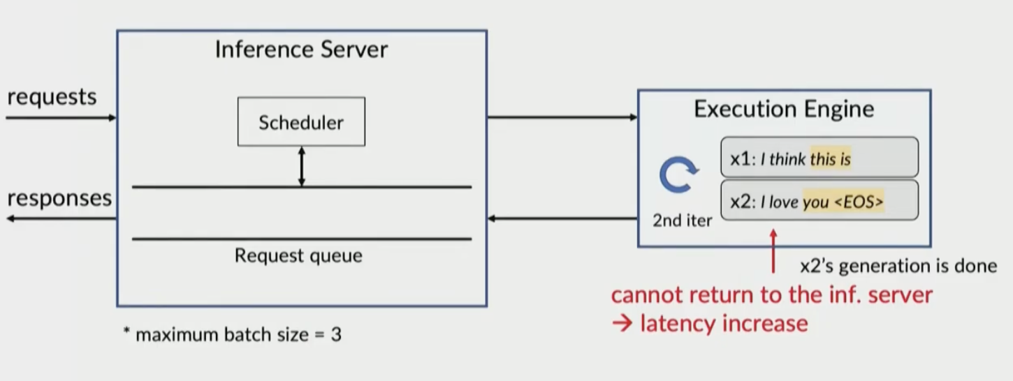 - generating next token in an autoregressive manner is difficult for existing system for inference due to their inflexible scheduling mechanism that cannot change the current batch of requests being proccesed