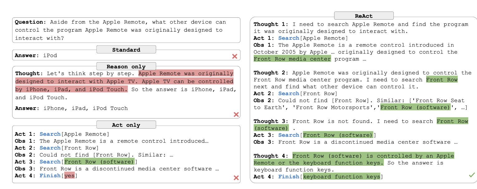 Explores LLMs to generate both reasoning traces and task-specific actions in an interleaved manner, allowing for greater synergy between the two: reasoning traces help the model induce, track and update action plans as well as handle exceptions, while action allow it to interface with external sources, such as knowledge bases or environments, to gather additional information.