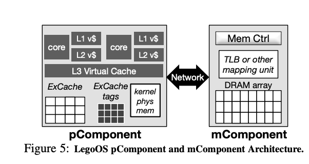 - LegoOS moves all hardware memory functionalities to mComponents (eg. page tables, TLBs) and only leaves caches at the pComponent side
