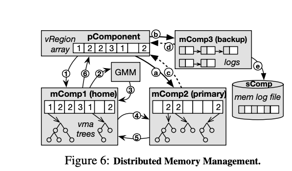 LegoOS maintains a small append-only log at the secondary mComponent and also replicates a vma (virtual memory area) tree there