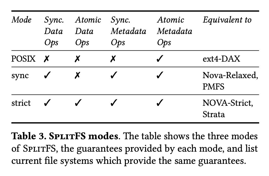 - User-space library file system in SpitFS allows each application to run with on of three consistency modes (POSIX, sync, strict)