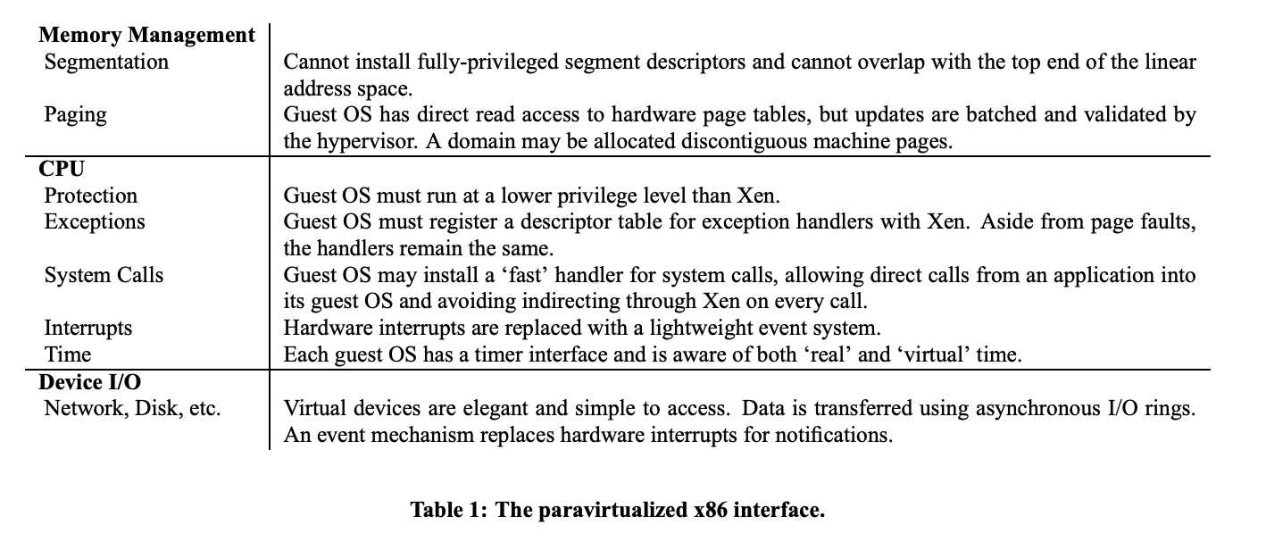- Each guest OS registers a “fast” exception handler without indirecting via ring 0. This is validated before installing it in the hardware exception table